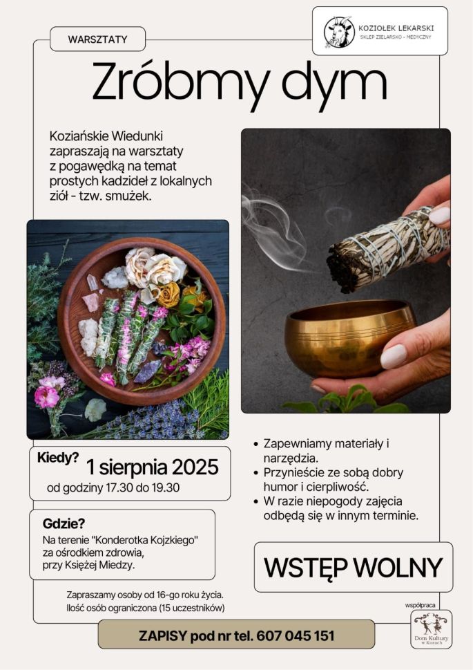Tworzymy własne proste kadzidła z lokalnych ziół, tzw. smużki, znane już u Słowian. Zapewniamy materiał i narzędzia (bezpłatne). Zbieramy grupę do 15 osób, od 16 r.ż. Zapisy pod tel. 607 045 151