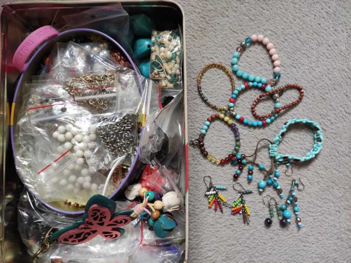 Po lewej stronie zdjęcia pudełko popsutej, zdekompletowanej biżuterii i resztki różnych koralików, kupione na pchlim targu za 25 zł. Po prawej stronie – to, co powoli udaje się stworzyć z tych elementów.