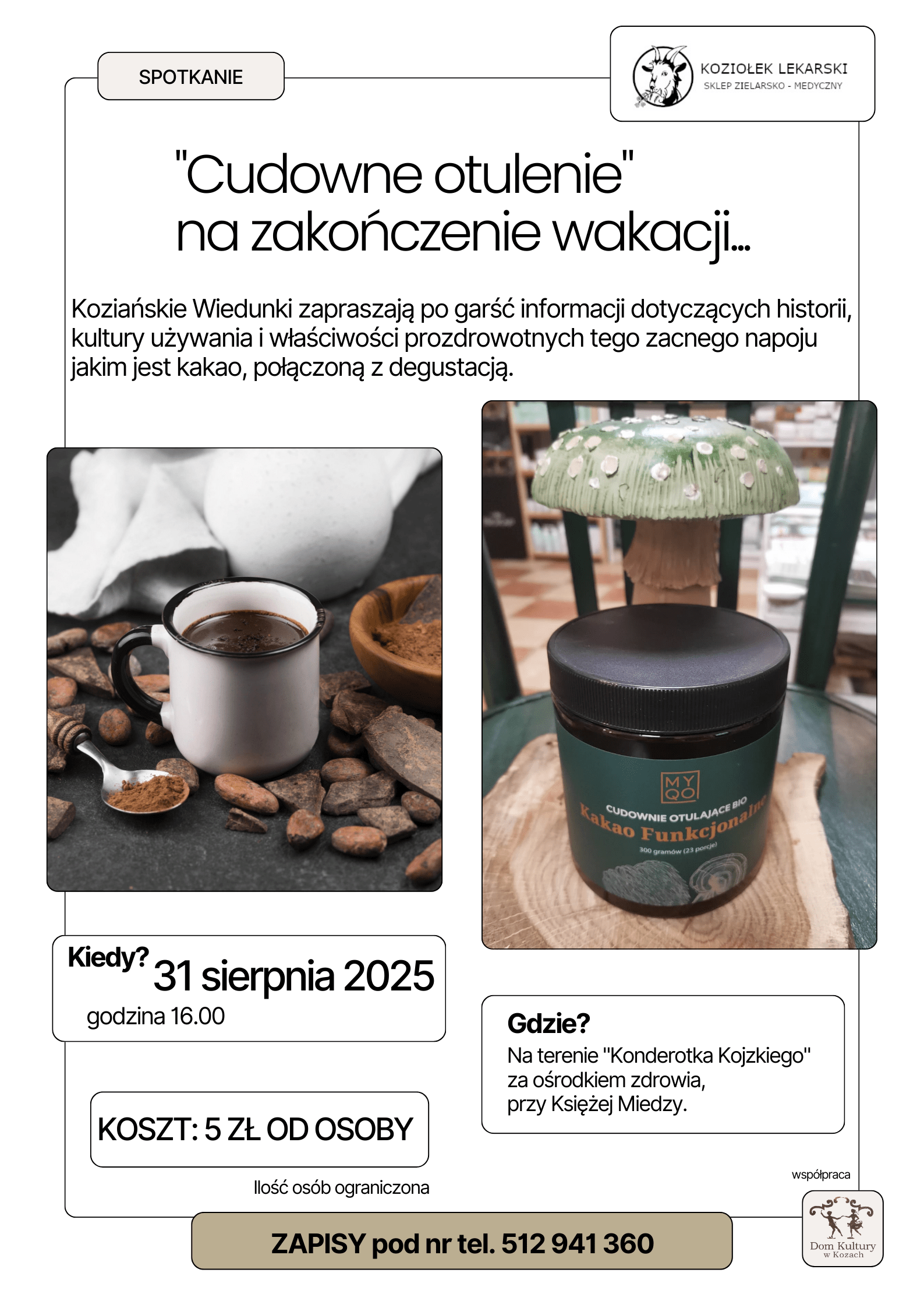 CUDOWNE OTULENIE – Spotkajmy się na kakale! 21 sierpnia, 202521 sierpnia, 2025 Autor Mikołaj Kuroczycki, opublikowano w WYDARZENIA - KOZIAŃSKIE WIEDUNKI Wiedunki zapraszają na wykład i degustację kakaa 🙂 Udostępnij: Udostępnij na X (Otwiera się w nowym oknie) X Udostępnij w serwisie Facebook (Otwiera się w nowym oknie) Facebook Lubię Wczytywanie… Powiązane