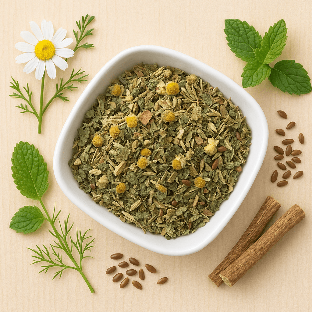 Łagodna, regenerująca mieszanka ziołowa opracowana z myślą o osobie z problemami jelitowymi (wzdęcia, zaparcia, osłabione trawienie, „nerwica” żołądka, zgaga). Działa uspokajająco, rozkurczowo, osłonowo i lekko regulująco – bez ryzyka nadmiernego przeczyszczenia.