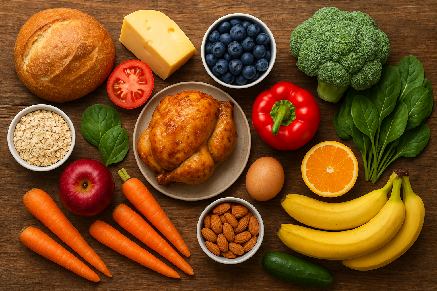 - Witaminy i minerały (surowe warzywa, owoce): np. potas reguluje ciśnienie, magnez wspiera układ nerwowy, witamina C wzmacnia odporność itp.