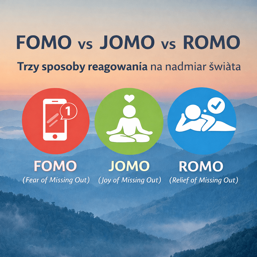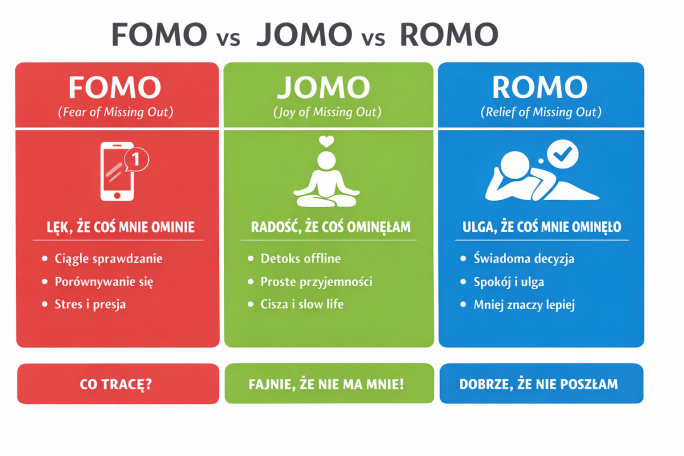 FOMO, JOMO i ROMO nie są cechami osobowości, lecz strategiami reagowania na współczesny świat. FOMO opiera się na lęku i porównywaniu się z innymi. JOMO proponuje radość z rezygnacji. ROMO natomiast wprowadza element dojrzałości emocjonalnej – akceptację faktu, że nie wszystko musi być dla nas.